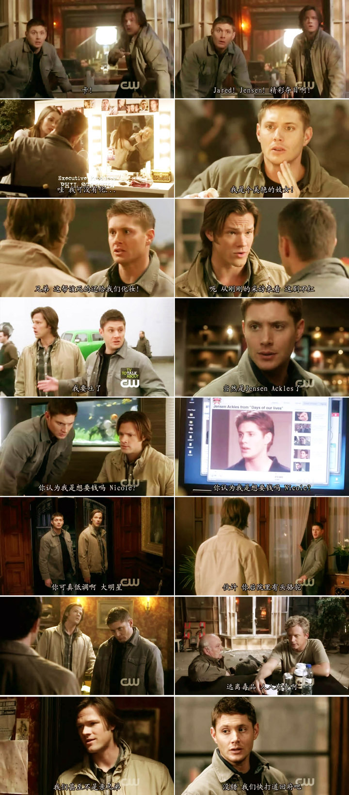 在一堆鸟人的追杀下SD兄弟这俩冤大头被鸟人之一扔出了窗外,刚摆出防御姿态便发现自己被一堆摄影器材对准和被一群人围观,还有着会摸Dean屁屁的咸湿大叔。倒霉的兄弟俩发现自己穿越进了一个又穷又狗血的小破剧,收视率还不高(剧组已经自暴自弃了…),自己则变成了Jensen和Jared,各种囧事件层出不穷,比如被当做道具的一排Impala,比如会在房车里放鱼缸的Jensen,比如Jensen以前像个软妹,还演了好多的肥皂剧,比如Jared有着像宫殿的一样豪宅,后院还养了只草泥马;比如J2两个人关系特别差,在剧外根本不讲话(跟现实的J2对比起来这实在太好笑了剧组有多喜欢反串啊XD)…………为了回到SPN的世界,兄弟俩还让J2两个人背了很多黑锅(倒卖人体器官神马的),还不得不客串SPN的拍摄——虽然俩兄弟就是剧里的角色,但是让他们演自己就生生演成了两个智障,导演和场记纷纷表示这俩是嗑药磕多了。